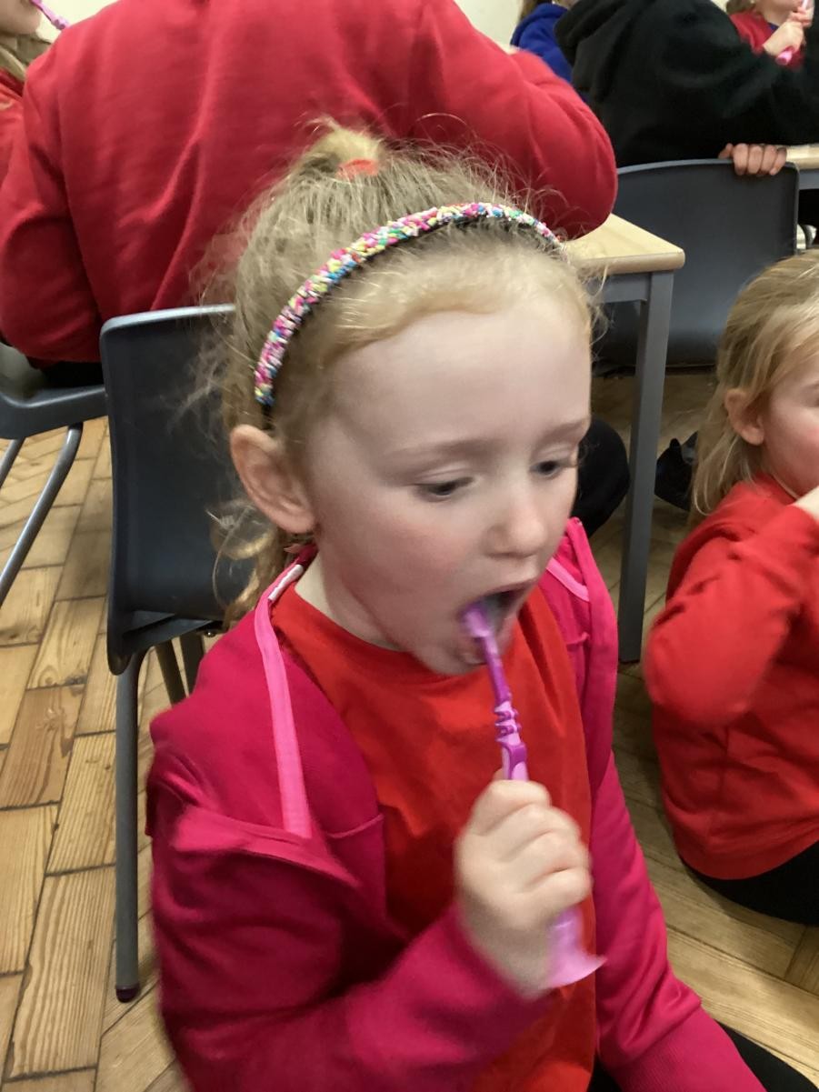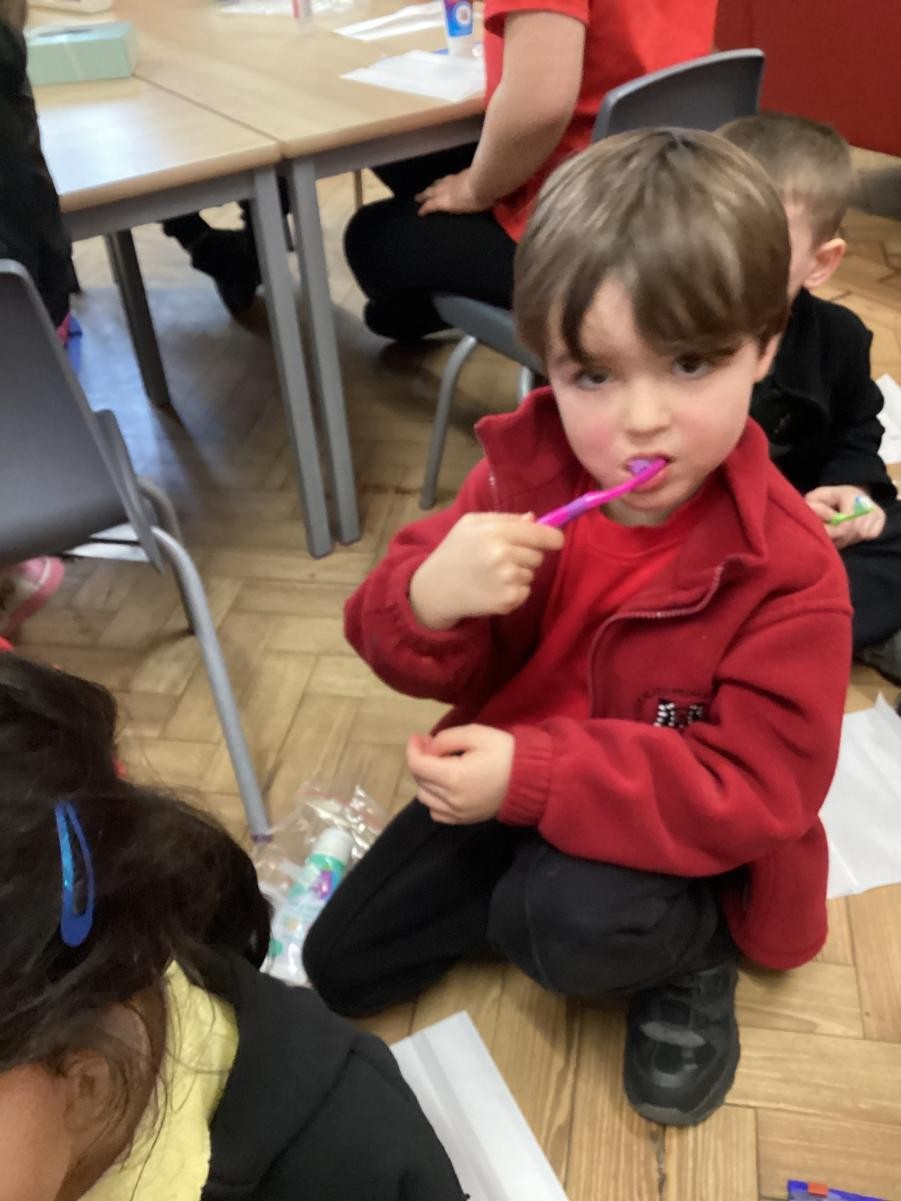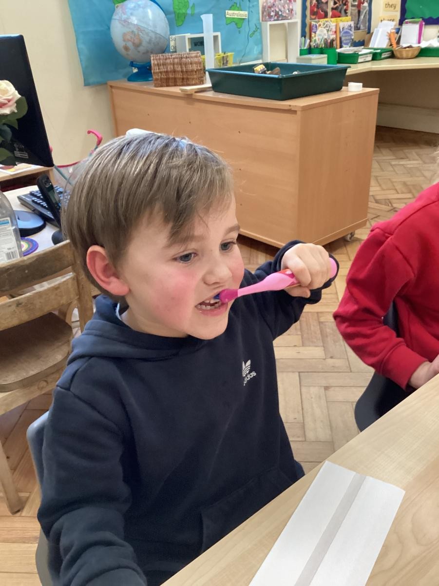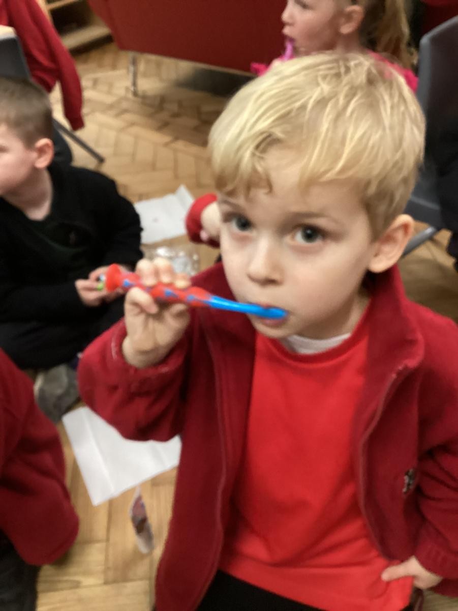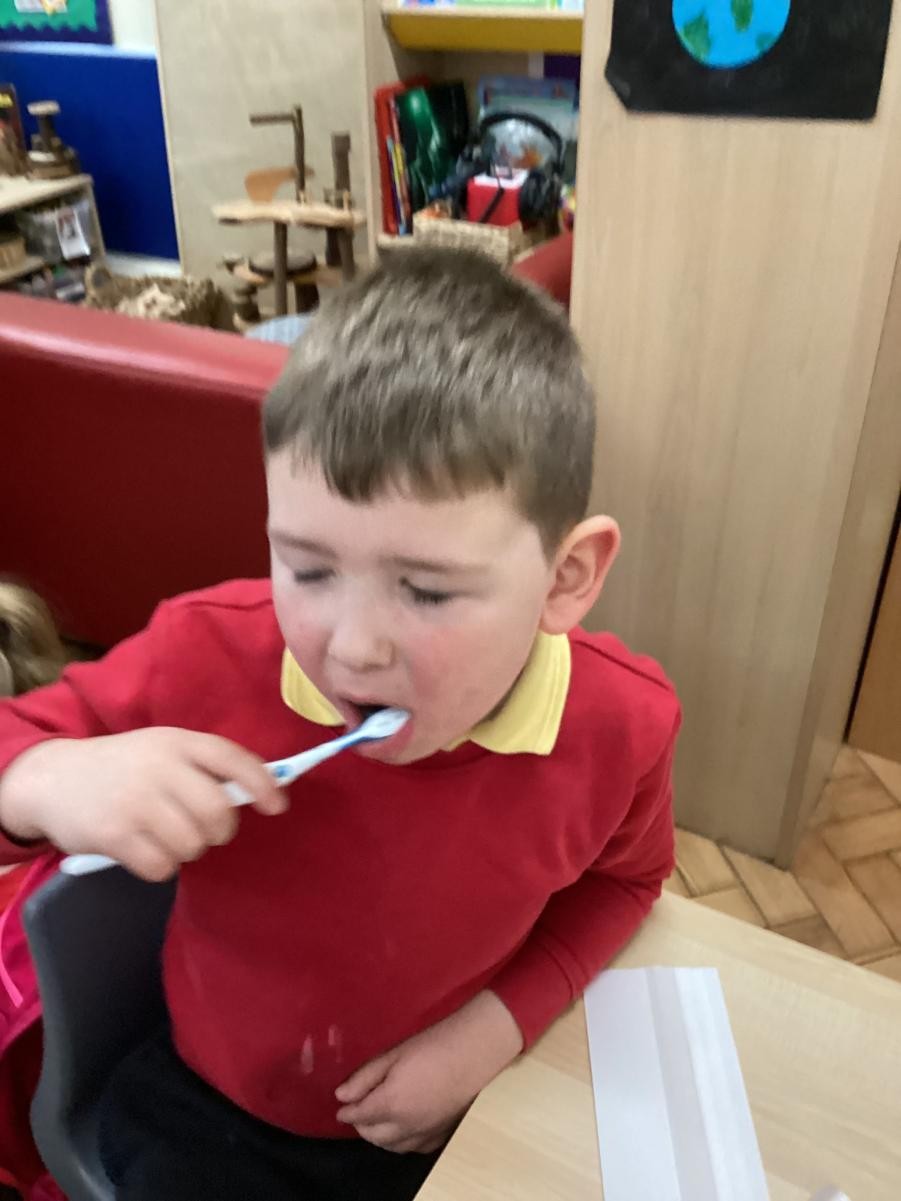 We practised brushing our teeth for two minutes. We listened to a song to help us.