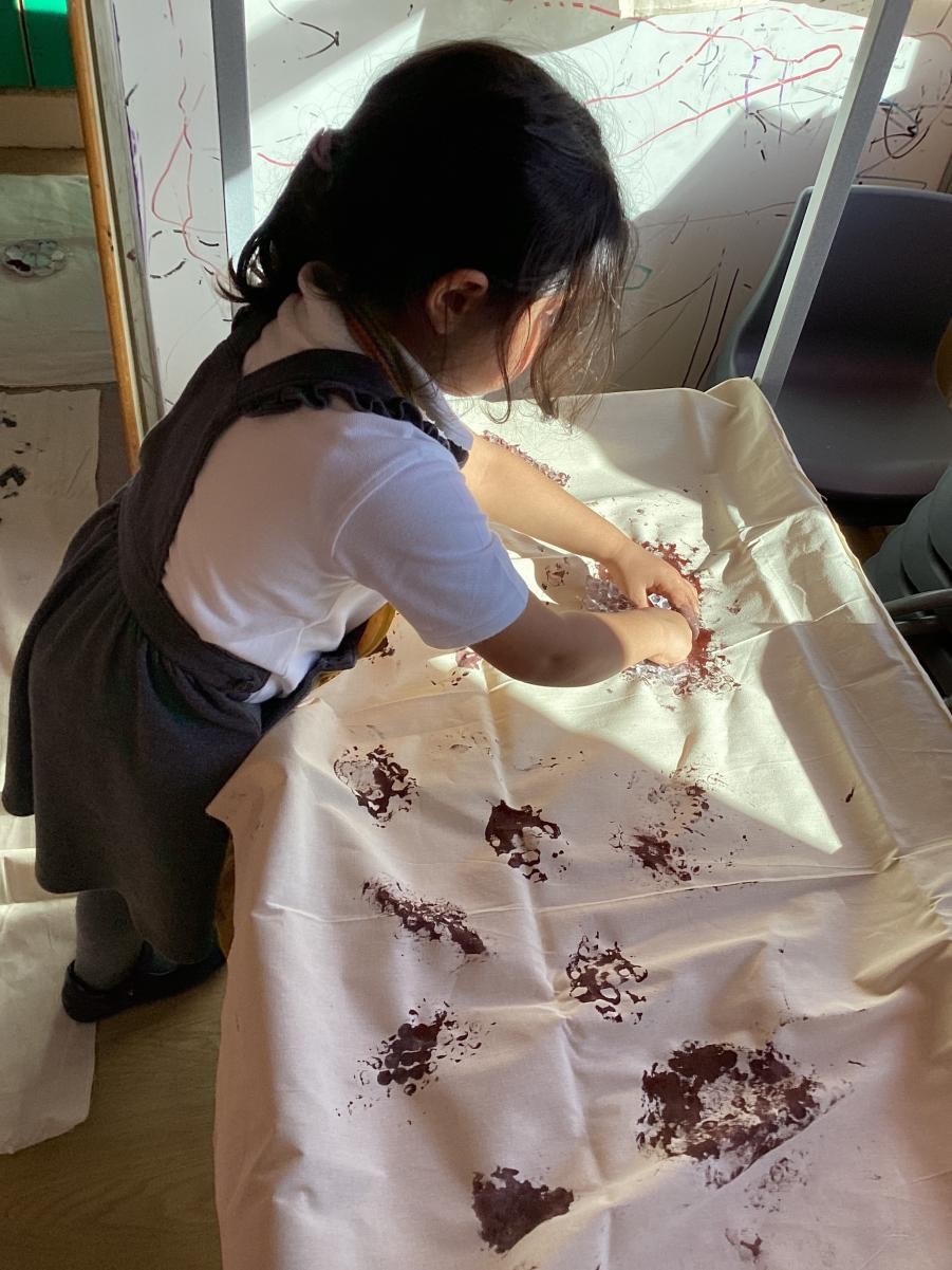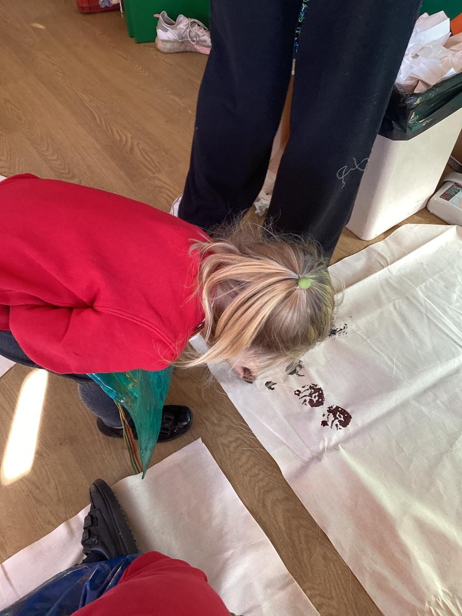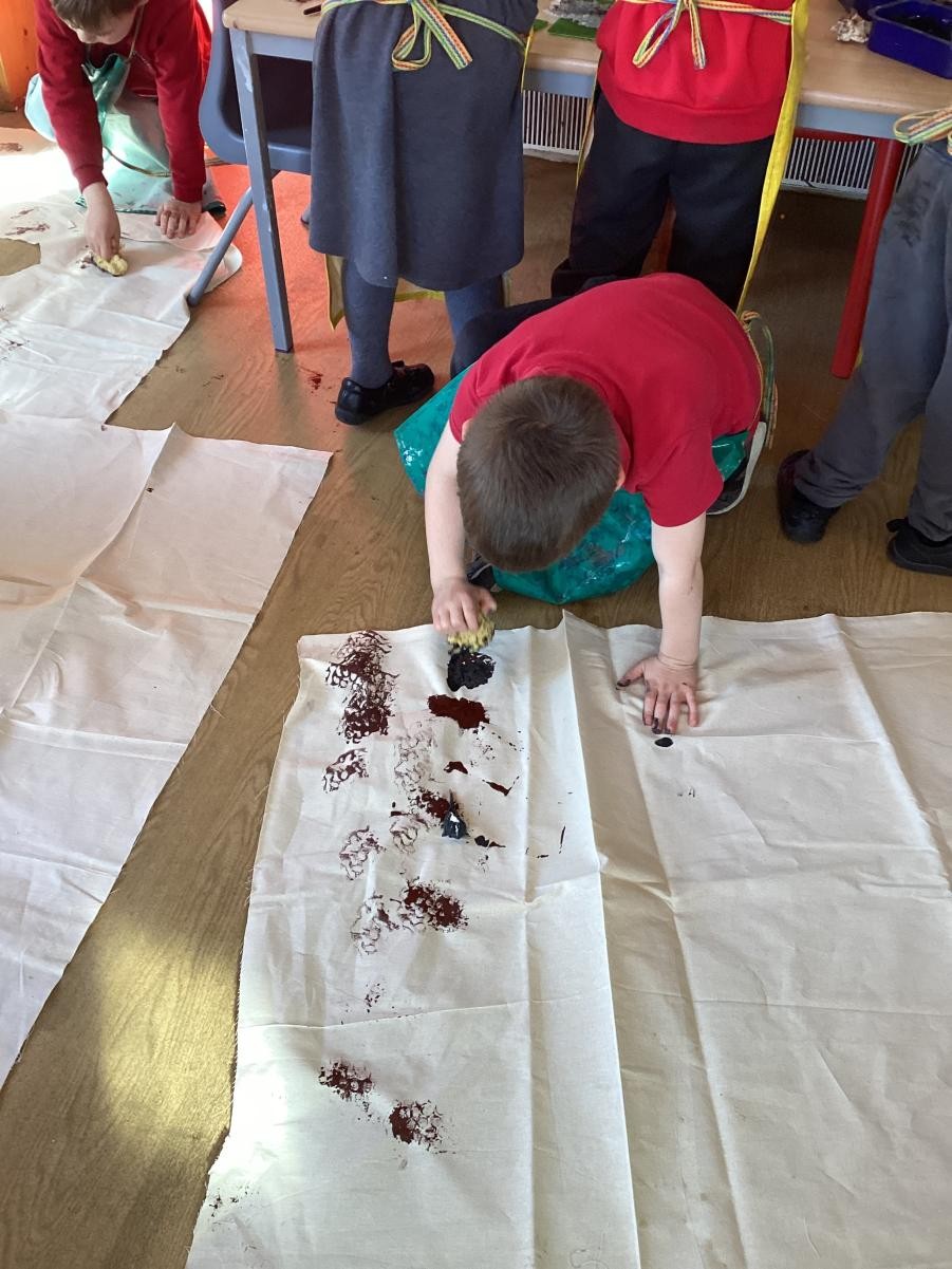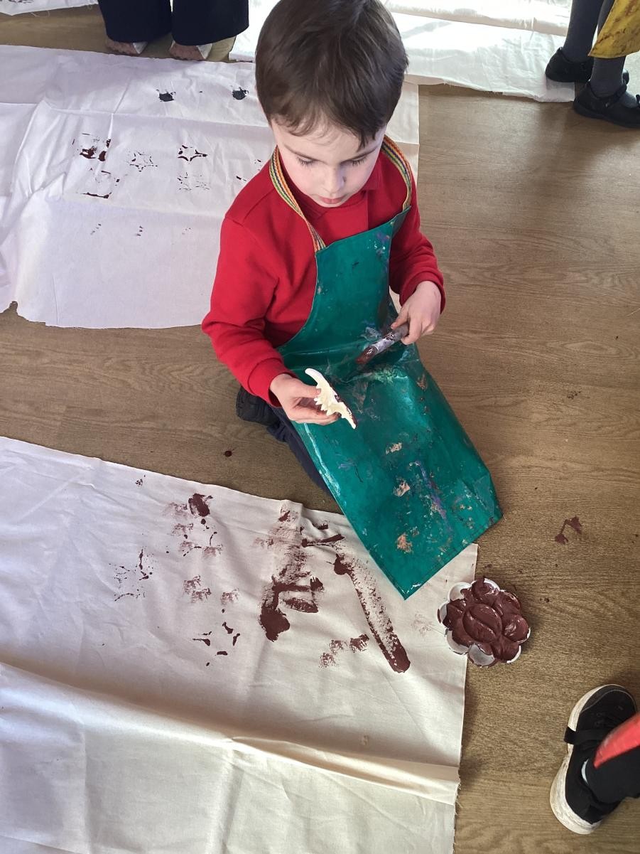 The Spots made their fossil outfits by printing on fabric. They used bubble wrap, sponges, shells and lots of other textures to create their designs.