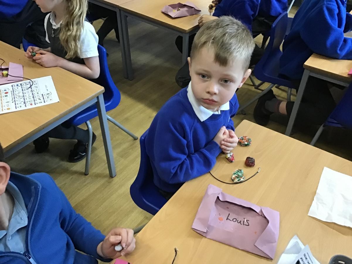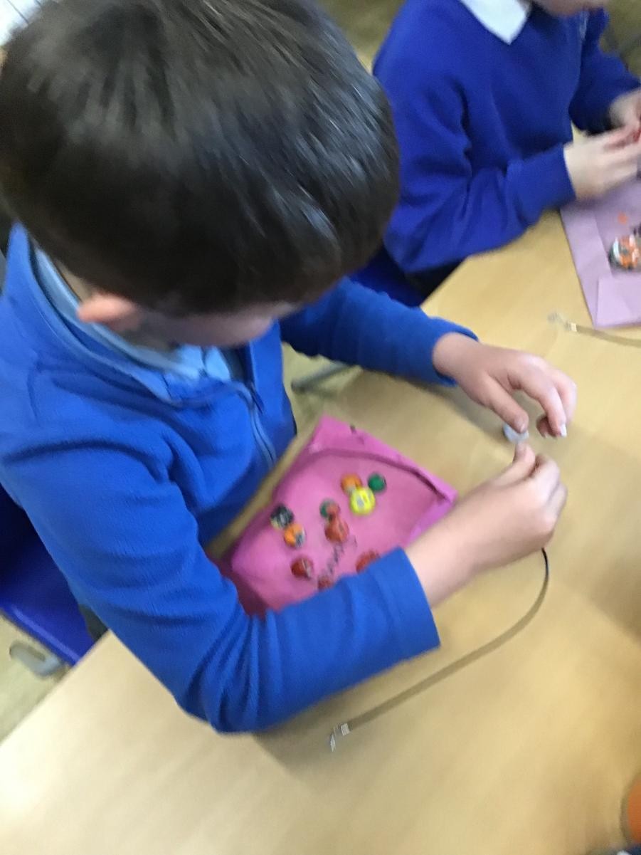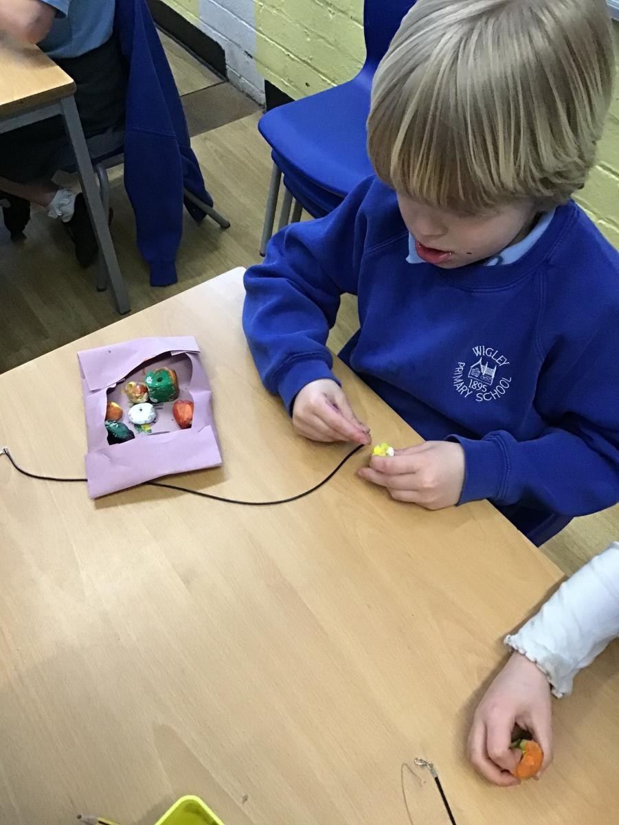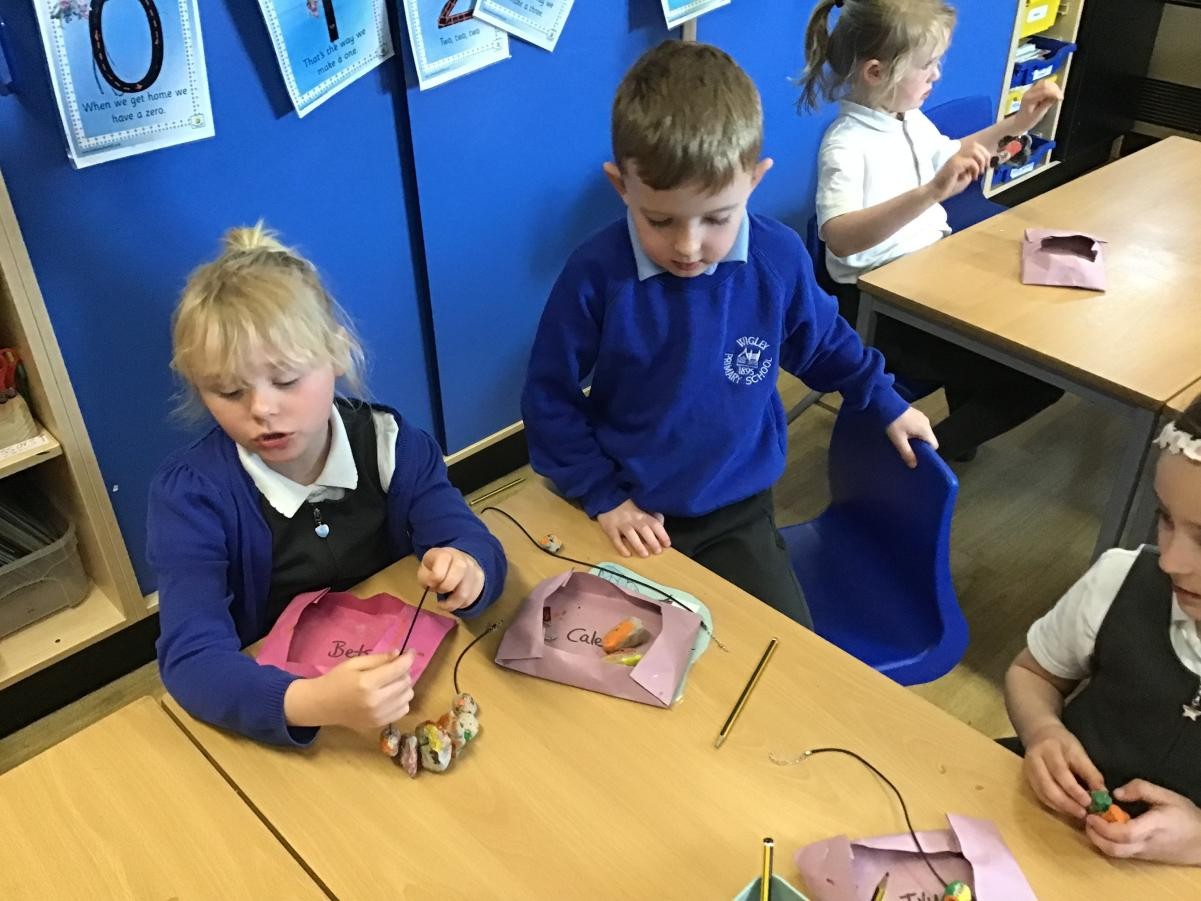 We finished our necklaces this afternoon by threading our painted clay beads onto our cords. This was tricky and we had to be very patient - a few of our holes needed drilling to make them big enough but we are very proud of our final results. Mr Ratcliffe came to join in the fun for a while too!