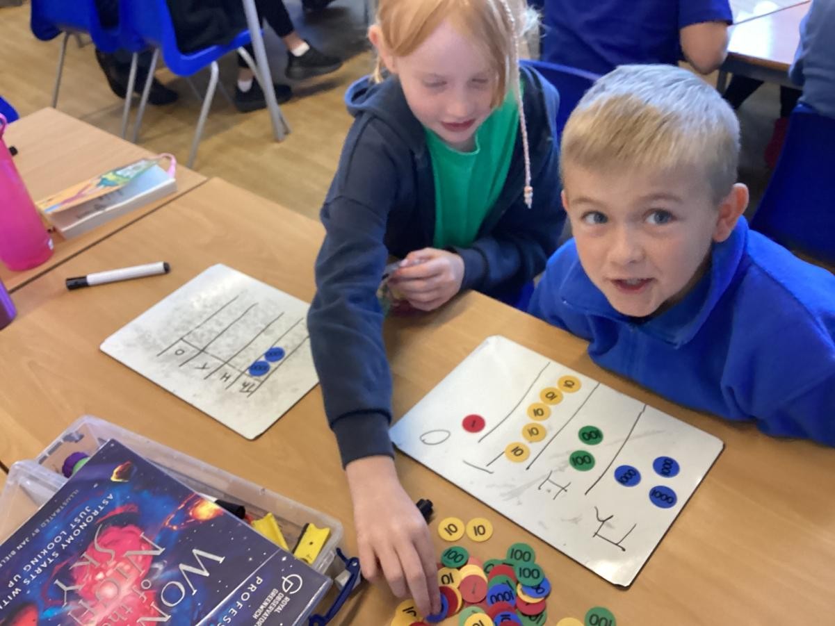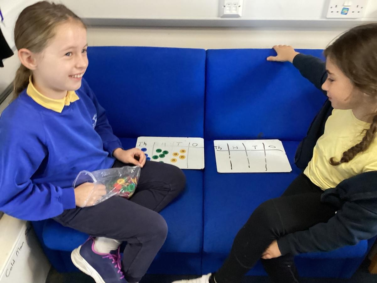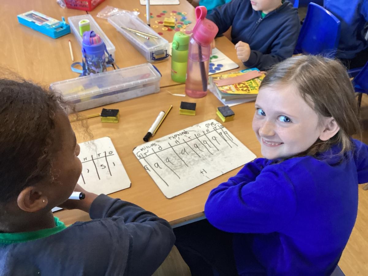 We have been looking at reading and writing increasingly large numbers. We have been working with a partner to add one more to one of the place value columns.