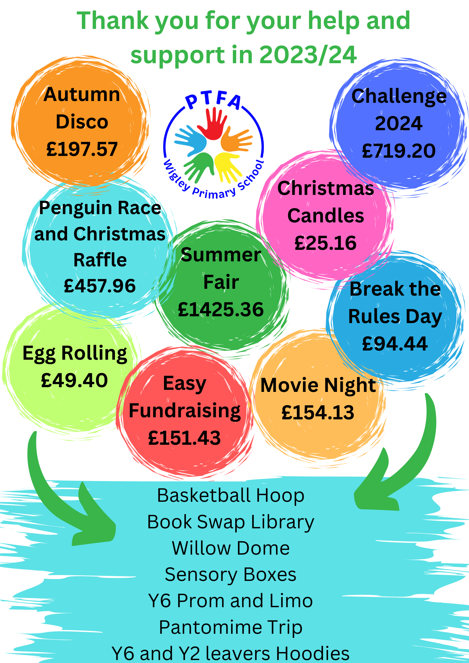 Every year the PTFA pays for Christmas and Graduation gifts including Y6 leavers hoodies, as well as paying for the children to go to the pantomime and putting on a prom for the Y6 leavers. We have purchased resources for the children to use in school such as cooking equipment, reading books, wet play toys and playground equipment.